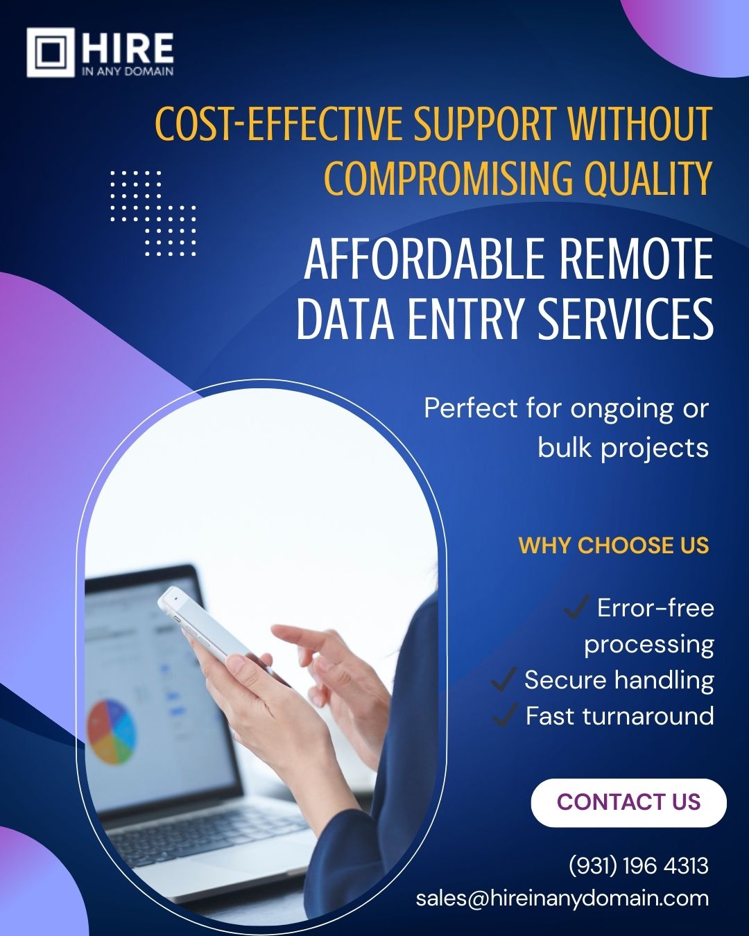 Affordable Remote Data Entry Services allow businesses to outsource repetitive tasks like documentation, form processing, PDF conversion, and CRM entry while saving time and money. With experienced data entry operators from India, you get speed, accuracy, and confidentiality with flexible hiring options. Perfect for eCommerce, healthcare, finance, education, real estate, and startups.