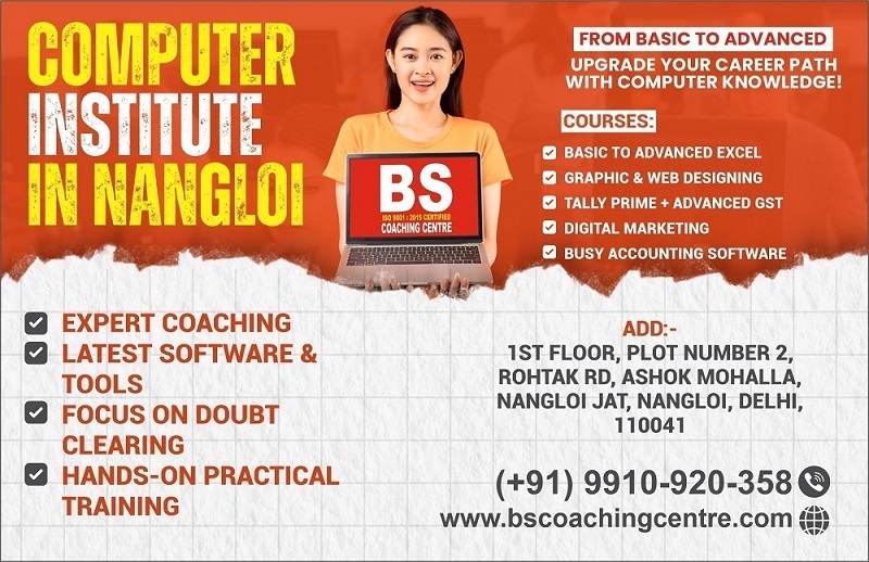At BS Coaching Centre, Computer Coaching in Nangloi is more than just trainingits about building real-life skills. Our courses are designed to meet the needs of students, job seekers, and working professionals who want to grow their careers in IT and computer fields. From the basics of MS Office to advanced programming and software training, we ensure every learner gets practical knowledge. The faculty at BS Coaching Centre is highly experienced and dedicated to making complex topics easy to understand. We also provide flexible batches and affordable fees so that learning becomes accessible to everyone. If youre searching for the right place to start your computer journey in Nangloi, BS Coaching Centre is the trusted name. Also know about Digital Marketing Coaching in Nangloi.