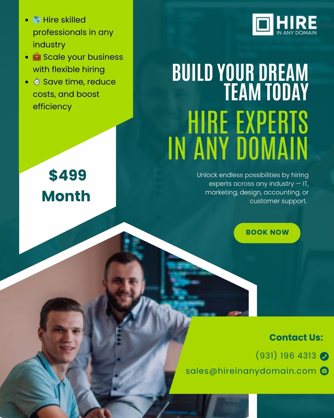 Hire in Any Domain is your trusted partner for outsourcing top professionals from India. Whether you need developers, accountants, digital marketers, or virtual assistants, we provide skilled talent tailored to your business goals. Our services ensure high-quality performance, data security, and significant cost savings. Scale your business effortlessly with experts who work as an extension of your in-house team.