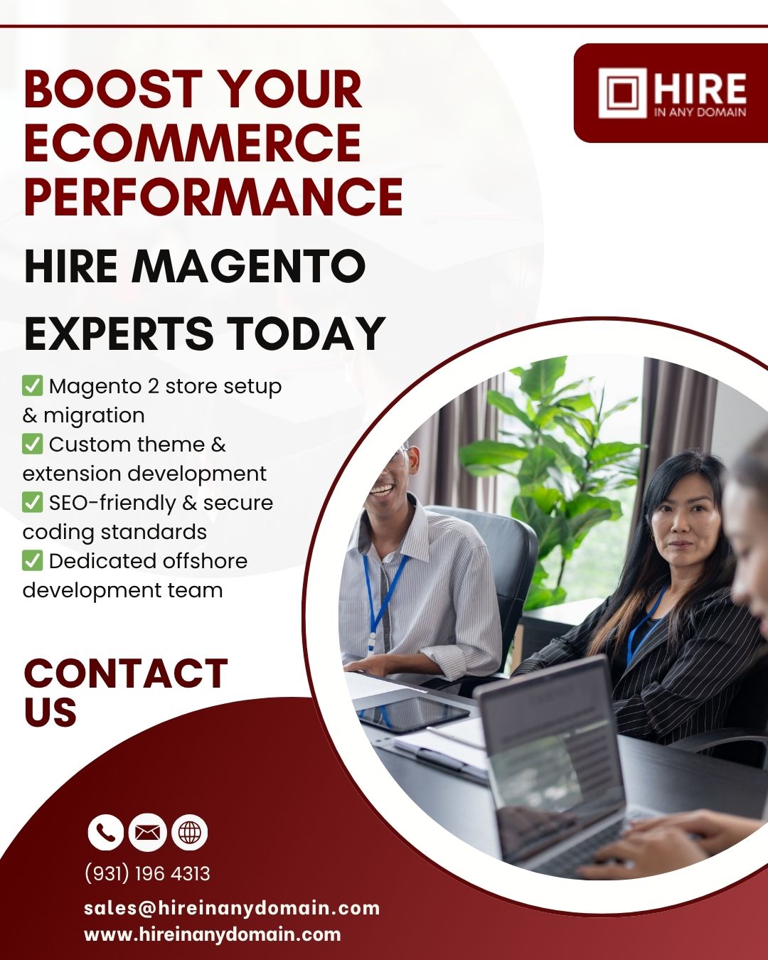 Scale your eCommerce business with an experienced offshore Magento expert from Hire in Any Domain. Our certified professionals build robust, scalable, and customized Magento stores tailored to your brand. From store setup to maintenance and performance optimization, we ensure your online business thrives efficiently and affordably.