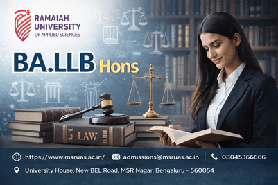 BA LLB (Hons.) MS Ramaiah University of Applied Sciences is a five-year integrated undergraduate programme that combines foundational education in arts and legal studies to prepare students for diverse careers in the legal profession. The curriculum spans ten semesters and balances subjects from the humanities (such as political science and sociology) with core law areas, including constitutional, criminal, contract, and international law, as well as practical training through moot courts, internships, research, and the development of advocacy skills. The Hons. component emphasizes academic excellence and specialised legal understanding. Graduates are equipped for roles in litigation, corporate law, legal consultancy, public service, and other law-related fields. Visit our website for more information.