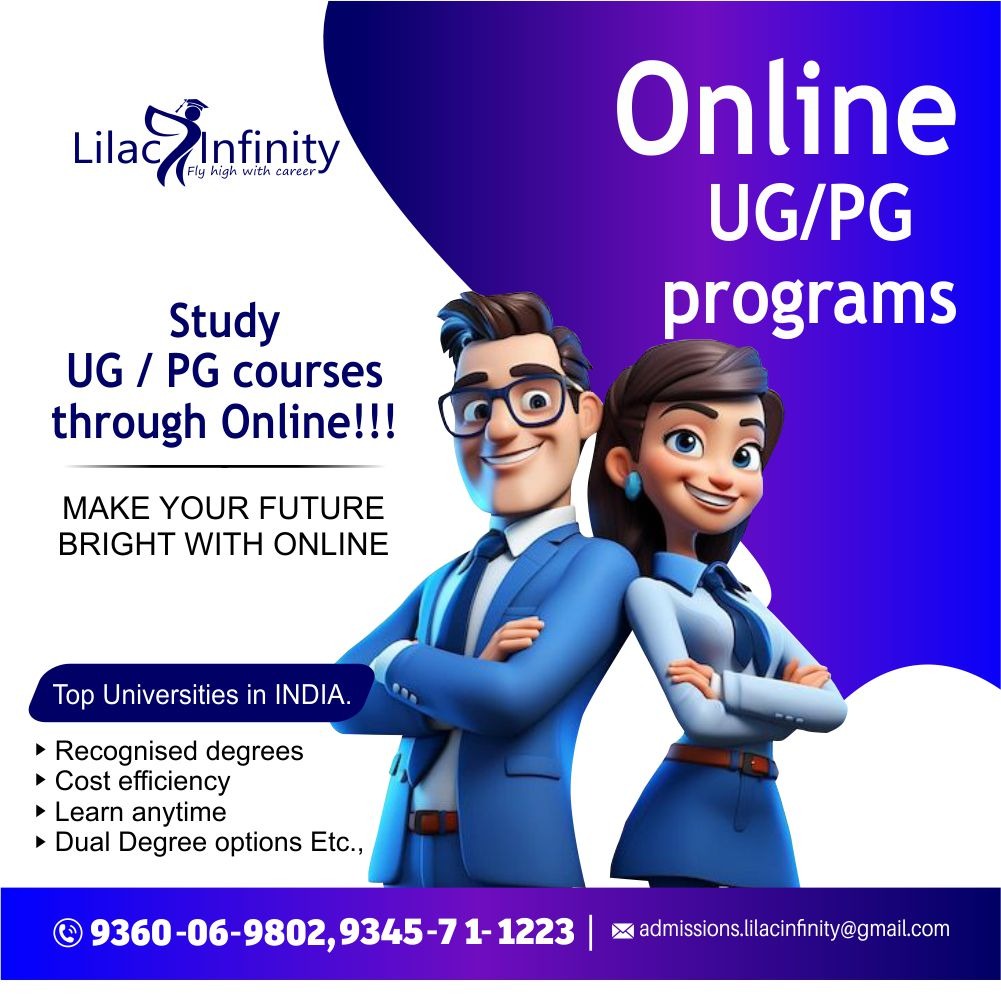 Lilac Infinity-fly high with career Study UG / PG courses through Online!!! MAKE YOUR FUTURE BRIGHT WITH ONLINE. Top Universities in INDIA. Recognised degrees | Cost efficiency | Learn anytime | Dual Degree options Etc., For more Details contact us: 9360069802