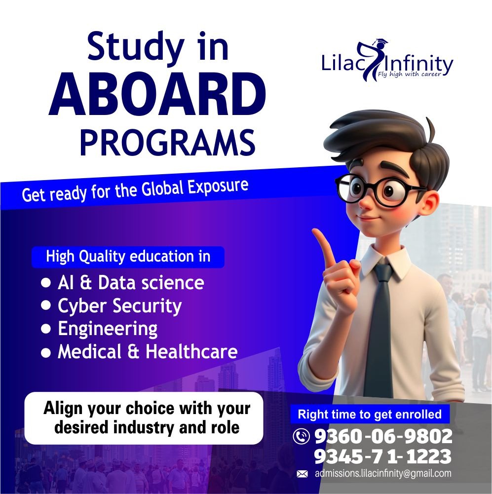 Lilac Infinityoffer Overseas Education Programs!! Get ready for the Global Exposure. High Quality education in AI & Data science | Cyber Security | Engineering | Medical & Healthcare. Align your choice with your desired industry and role. Check your eligibility now!! For more details : Contact us: 9360069802