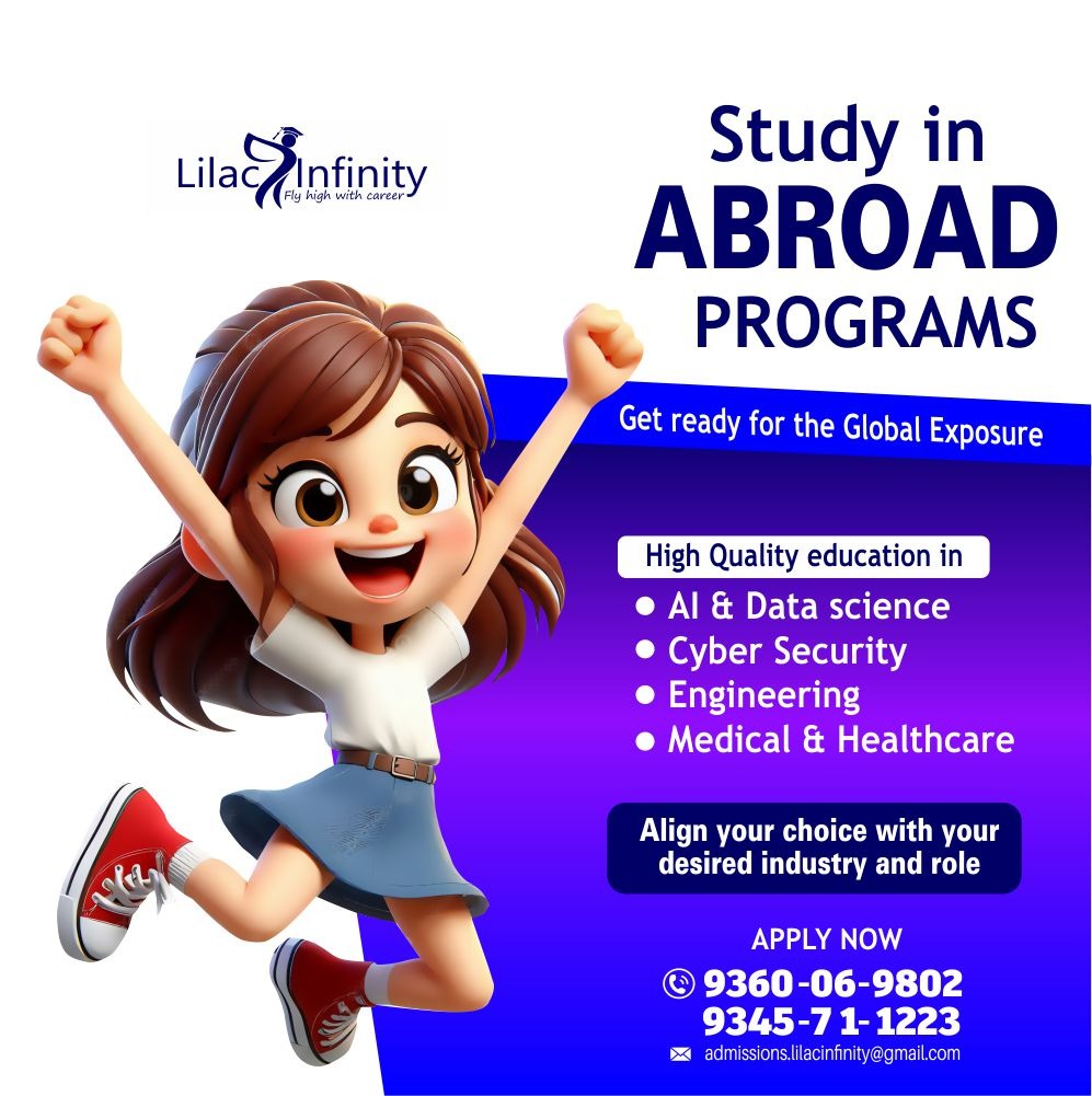 Lilac Infinity offers a study abroad program specializing in AI, Data Science, Cyber security, Medical and Healthcare courses, delivering hands-on expertise in machine learning, business analytics, and AI-driven innovation, preparing graduates for high-impact roles in MS in Data Science, AI, or Computer Science.Lilac Infinity study abroad program also exists in fields that offer high salaries and consistent growth as a professional skill development program -- Lilac Infinity offers study abroad programs in AI, Cyber security, Engineering and Data Science with. Connect with Lilac Infinity young expert counsellors.