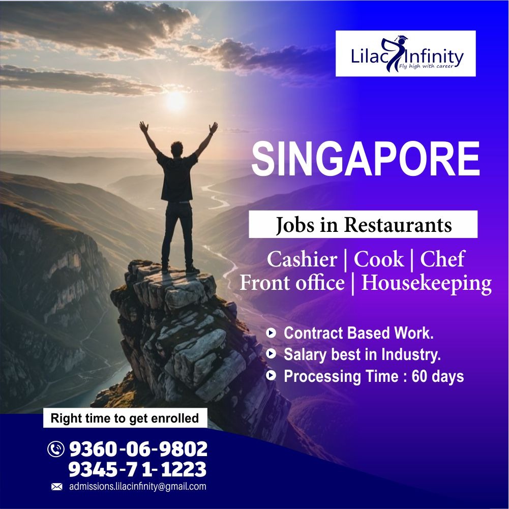 Lilac Infinity Singapore Job Opportunities!!! Jobs in Restaurants. Cashier | Cook | Chef | Front office | Housekeeping. Contract based work. Processing time: 60 days. Get complete guidance from us. Check Eligibility now!!!Contact us: 9360069802