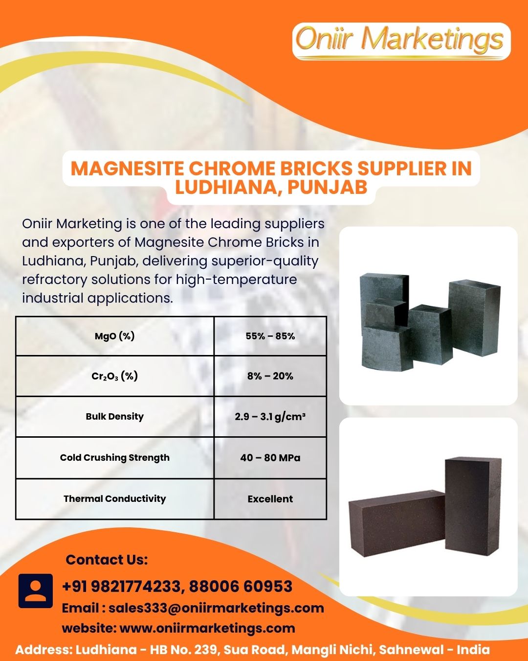 Oniir Marketing is a reputed supplier of Magnesite Chrome Bricks in Ludhiana, Punjab, providing premium refractory solutions for high-temperature applications. Made from high-quality magnesite and chrome, these bricks offer excellent corrosion, abrasion, and thermal shock resistance, ensuring superior performance in steel furnaces, cement kilns, and glass industries. Our Magnesite Chrome Bricks in Mandi Gobindgarh are known for their durability, strength, and reliability under extreme heat conditions. Oniir Marketing ensures consistent quality, competitive pricing, and timely delivery, making us a trusted partner for industries across Punjab and beyond.