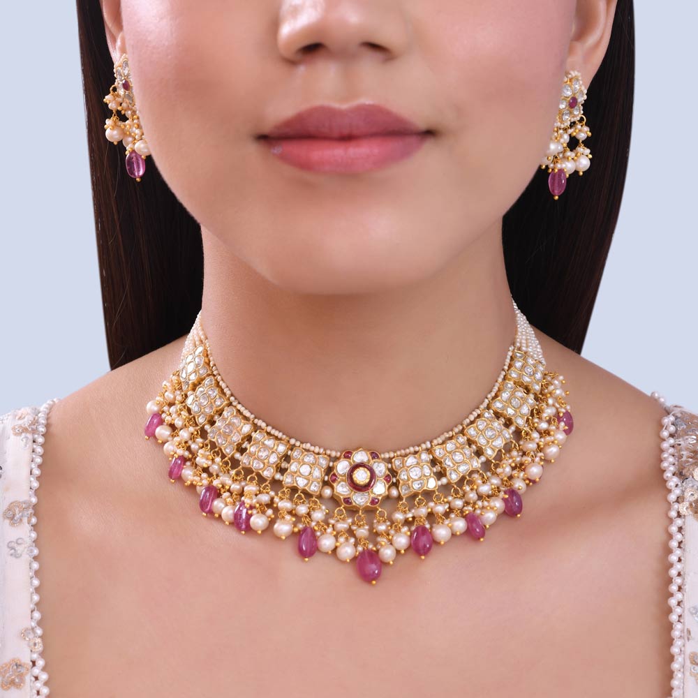 Discover perfect Polki Sets crafted in pure 22 Karat Gold, featuring a beautifully designed necklace adorned with classic pearls. Perfect for brides and special occasions, these sets add unmatched class and charm. complete your style with handcrafted luxury from Jadaav Jewels, where tradition meets classic beauty.