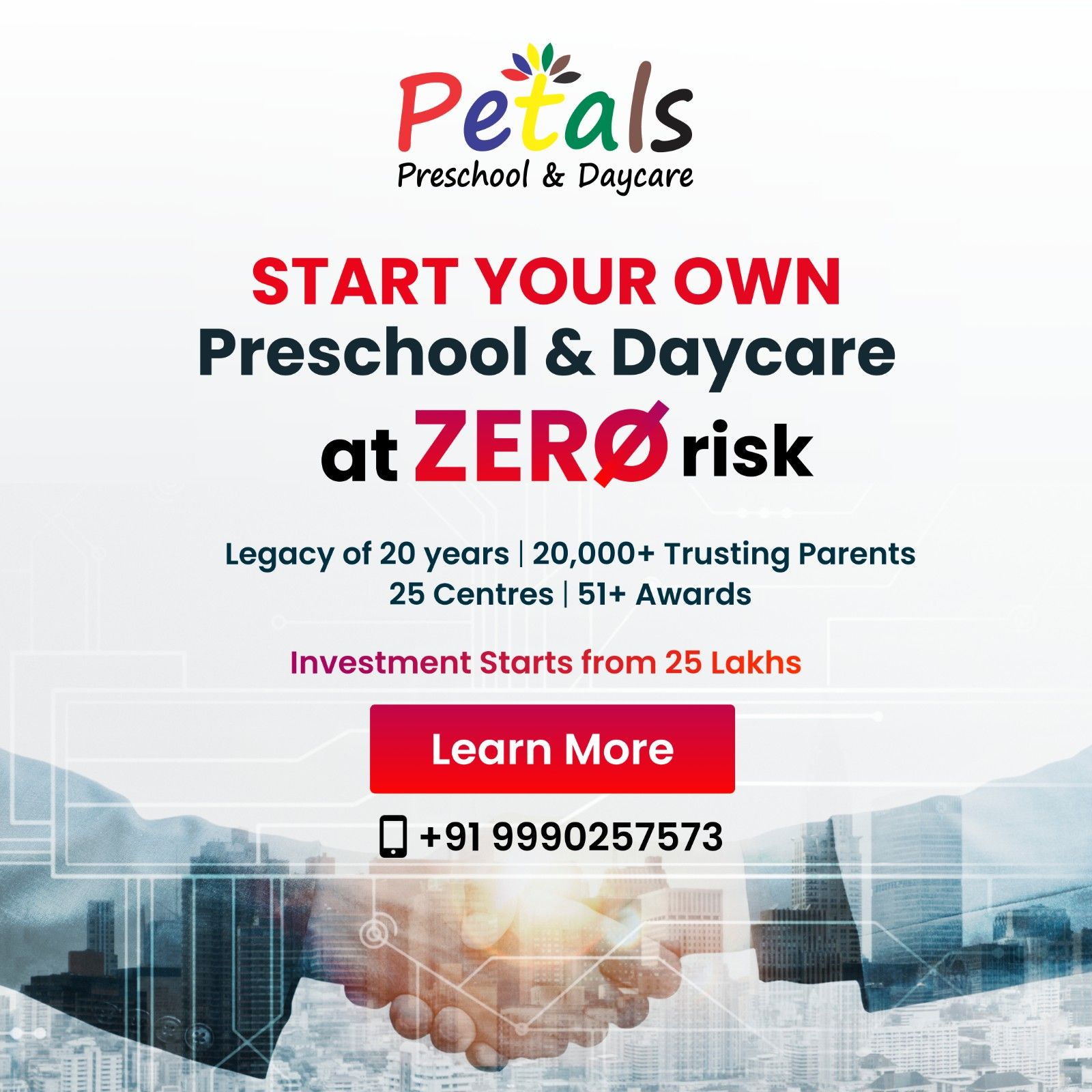 Build a high-performance business with apreschool franchise in delhi that blends innovation with a zero-risk financial model. Petals Preschool supports your journey with a 40% ROI and 100 guaranteed admissions from day one. We offer a safety net through our buyback option and full risk protection. Our expert team provides end-to-end support and technology-enabled operations, making it simple to scale your school successfully