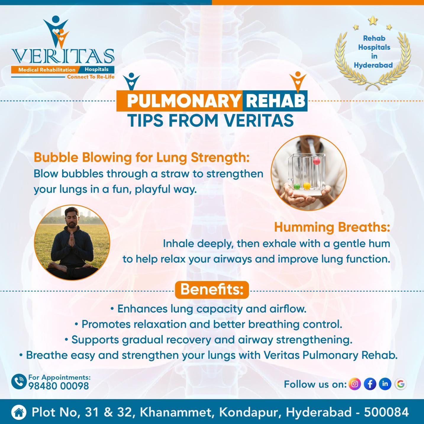 Veritas Hospitals offers expert Pulmonary Rehabilitation in Hyderabad, providing specialized care for patients with chronic respiratory conditions such as COPD, asthma, pulmonary fibrosis, and post-COVID lung complications. Our comprehensive program includes breathing exercises, oxygen therapy, physiotherapy, and lifestyle counseling to improve lung function and overall well-being. With a team of experienced pulmonologists and rehabilitation specialists, we create personalized treatment plans to enhance breathing efficiency and daily activity levels.