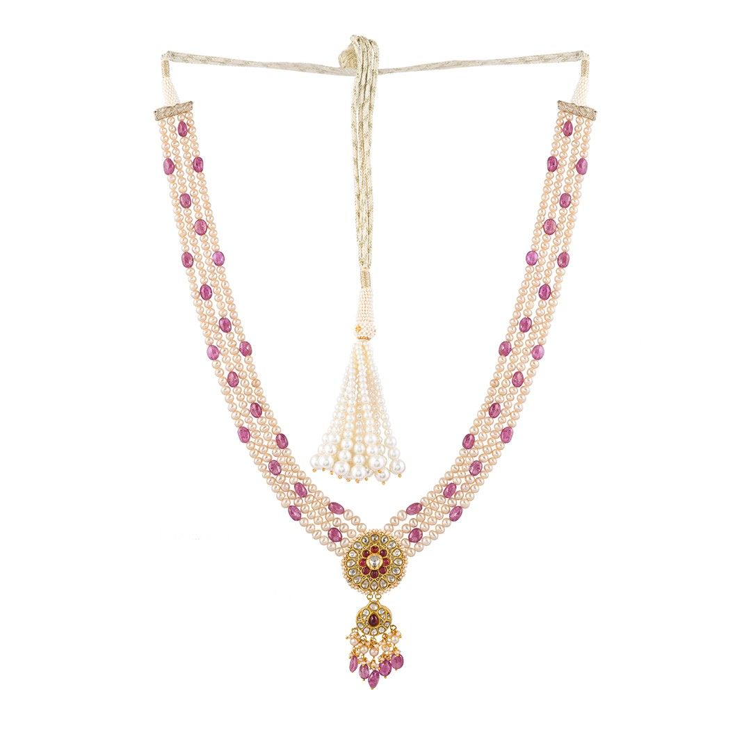 Experience the beauty of Uncut Diamond jewellery crafted in pure 22 Karat Gold, paired with a stunning Pearl Magenta Beaded Necklace for a rich, royal look. Perfect for weddings and special celebrations. Add classic beauty to your collection with exclusive handcrafted pieces from Jadaav Jewels, where luxury meets perfection.
